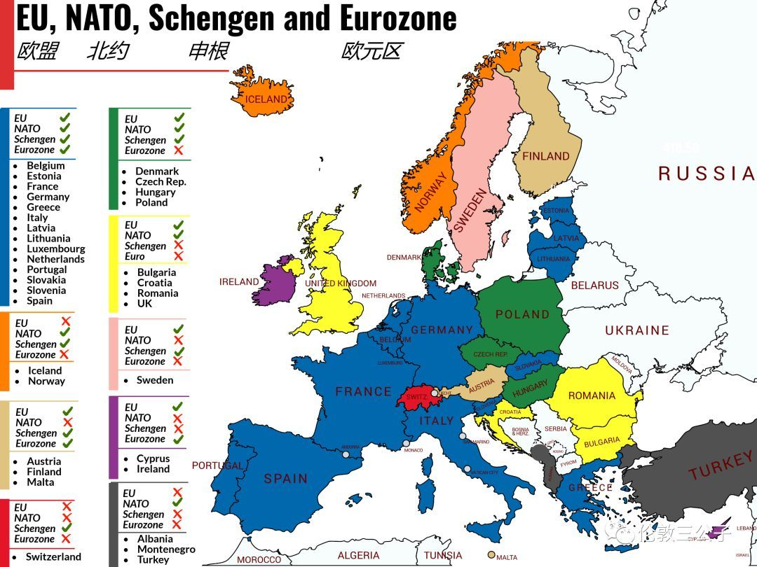 歐盟、歐元區、申根區和北約,就是目前歐洲涉及的四大條約組織,截止到2018年10月,各個國家參與這四大條約的關係見圖。